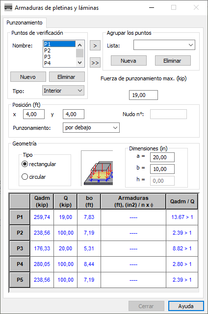 En el análisis de punzonamiento de cada tabla de puntos de verificación, se muestran los valores siguientes: