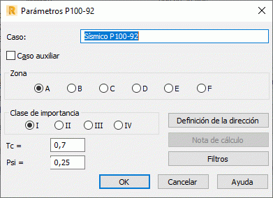 Los parámetros de un análisis sísmico de la estructura dependen de una norma sísmica utilizada durante los cálculos de una estructura influida por el impacto sísmico. Seleccione la norma sísmica rumana P100-92 en el cuadro de diálogo Nueva definición de caso o haga clic en Parámetros en el cuadro de diálogo Tipo de análisis.