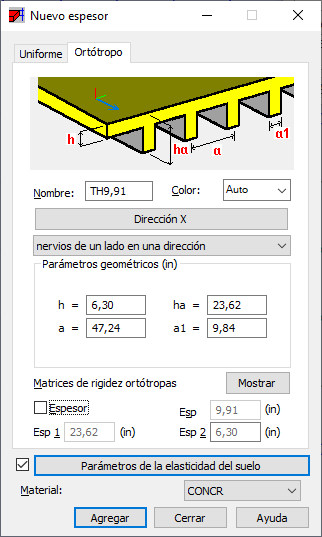 La opción Ortótropo reconoce la ortotropía estructural de las losas y las láminas. La ortotropía estructural hace referencia a la falta de uniformidad de la rigidez de la losa en diferentes direcciones, debido, por ejemplo, a la nervurada de la losa. La ortotropía reconoce las diferencias en la rigidez en las direcciones perpendiculares entre sí, pero no reconoce la falta de uniformidad del material. La totalidad de las heterogeneidades geométricas se reconocen únicamente en las matrices de rigidez de los elementos. Una losa con un espesor definido de esta forma debe tratarse como una estructura con un espesor equivalente, pero con diferentes rigideces en direcciones perpendiculares.