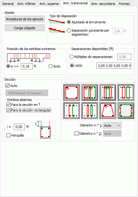 Una vez que se haya activado el comando Disposición de armaduras y se haya seleccionado la ficha Armadura transversal, aparecerá en la pantalla el cuadro de diálogo que se muestra a continuación.