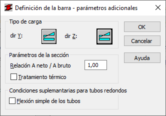 - Parámetros de la sección: Proporción Aneto/Abruto se aplica a un esfuerzo de tracción que actúa en el cable. Se trata de un coeficiente que define la relación del área de sección transversal de la barra, sin tener en cuenta los huecos de tornillo o remache (Aneto), con el área de sección transversal total (Abruto).