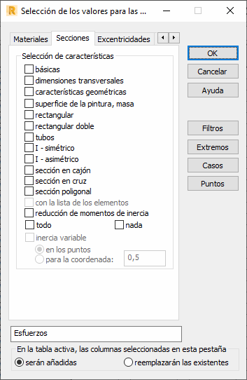 Se pueden seleccionar los siguientes datos relativos a secciones de barras.