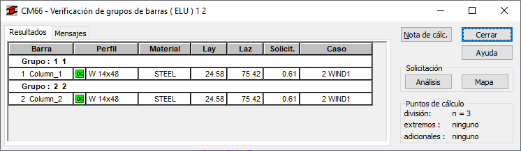 En la ficha Resultados del cuadro de diálogo Verificación, se muestran los resultados del proceso de verificación o dimensionamiento de las barras de acero, madera o aluminio, o de un grupo de barras.