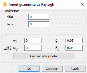 La matriz de amortiguamiento C se calcula como una combinación de la rigidez K y la matriz de masas M teniendo en cuenta los siguientes parámetros enumerados: