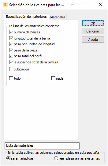 En la opción La lista de los materiales concierne, puede seleccionar los siguientes parámetros: