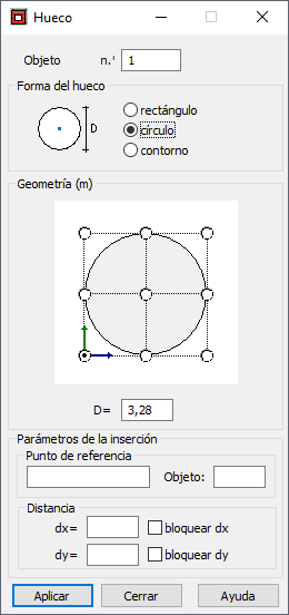 Especifique las coordenadas del punto desde el que se medirán los valores de las excentricidades dx y dy. El número del objeto activo en el que se definirá el hueco se muestra en el campo Objeto.