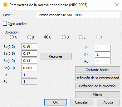 Los parámetros de un análisis sísmico de la estructura dependen de una norma sísmica utilizada durante los cálculos de una estructura influida por cargas sísmicas. Seleccione la norma sísmica canadiense NBC 2005 en el cuadro de diálogo Definición de un nuevo caso o haga clic en Parámetros en el cuadro de diálogo Tipo de análisis.