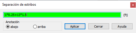Esta opción se utiliza para modificar manualmente la separación entre los estribos (en la armadura transversal del pilar). Está disponible después de seleccionar el comando Armadura / Separación entre estribos en el menú.