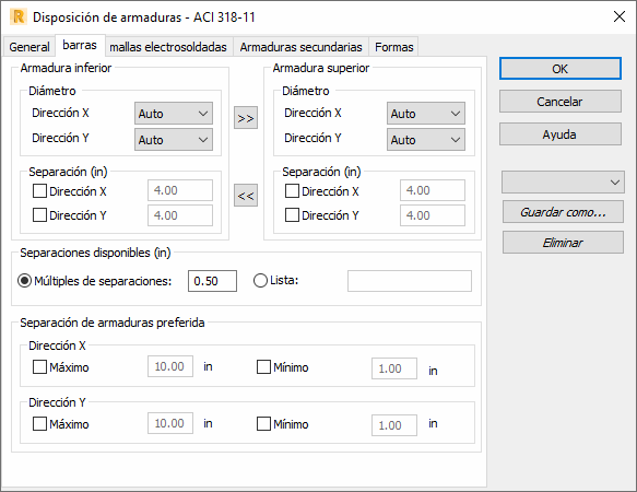 Los campos de separación imponen la separación de las barras de armadura en cada dirección y capa de armadura.