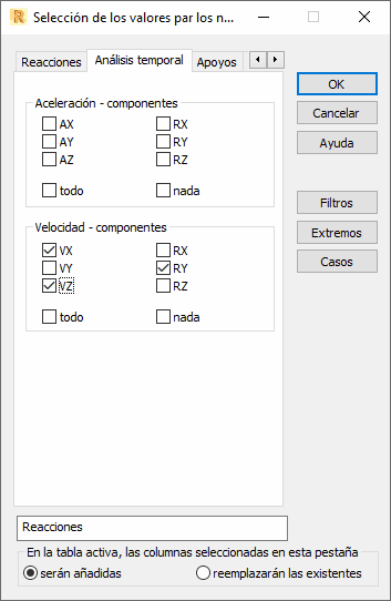 Seleccione los componentes de velocidad y aceleración de los desplazamientos para el caso de análisis temporal. (Tablas de nudos de estructura).