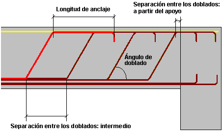 En la parte inferior del cuadro de diálogo se encuentra la opción Barras dobladas. Si la opción Doblado de las armaduras inferiores o Doblado de las armaduras superiores está activada, se pueden utilizar barras dobladas durante los cálculos de armaduras de viga. Solo se generarán barras dobladas si el número de capas de armadura es mayor que uno y al menos una de las capas de la armadura termina dentro del tramo.