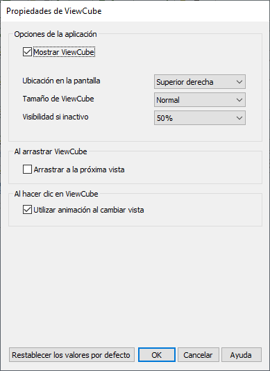 Esta opción permite especificar los parámetros de aspecto de ViewCube. Para acceder a la opción, seleccione el menú Vista > ViewCube - propiedades.