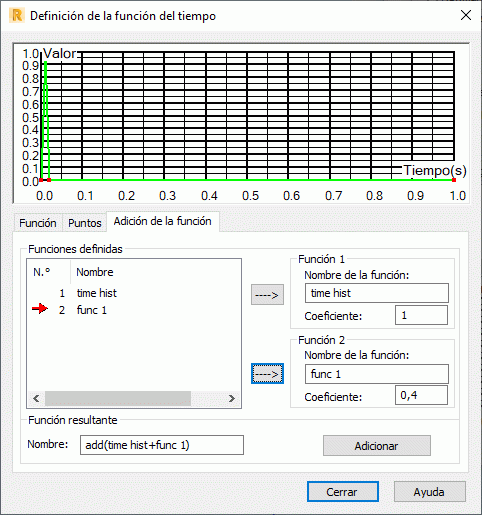 Nota: El valor de la función resultante se interpolará en los puntos con abscisas comunes. Cada una de las funciones definidas se puede multiplicar por un coeficiente definido por el usuario.