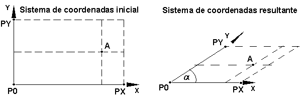 - Las direcciones de los ejes se definen especificando la posición de los puntos PX, PY y PZ para los sistemas de coordenadas inicial y resultante. Las longitudes de los segmentos P0-PX, P0-PY y P0-PZ de los sistemas de coordenadas inicial y resultante no tienen por qué ser idénticos, por lo que la determinación de la posición de cualquier punto en el sistema de coordenadas resultante se basa en las proporciones entre los segmentos que definen los ejes individuales en los sistemas de coordenadas inicial y resultante. El siguiente ejemplo muestra una situación de este tipo (para un sistema de coordenadas 2D): el sistema de coordenadas inicial es ortogonal; mientras que los ejes del sistema de coordenadas resultante se cruzan en el ángulo a; la posición del punto A se muestra en el sistema de coordenadas inicial y en el resultante.