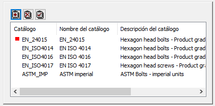 Los catálogos de tornillos activos se muestran en este cuadro de diálogo. Organice la lista con las siguientes herramientas: