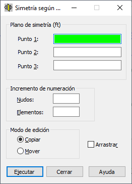 Una vez seleccionado el modo de cursor Rejilla o Auto, las coordenadas de los puntos que describen la simetría según un plano se muestran en los campos Punto 1, Punto 2 y Punto 3. Si se selecciona el modo de cursor Nudo, el número de nudos que definen el plano de simetría según un plano se muestra en los campos Punto 1, Punto 2 y Punto 3.
