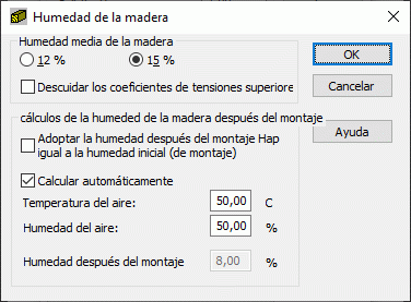 - Humedad media de la madera (humedad de referencia); seleccione uno de los 2 valores (12 o 15 %) que tiene efecto sobre el método de cálculo de los coeficientes de reducción de la resistencia de la madera (para compresión y flexión): coef.humflex y coef.humcomp