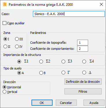 Los parámetros del análisis sísmico de una estructura dependen de la norma sísmica utilizada durante los cálculos de una estructura influida por el impacto sísmico. Seleccione la norma sísmica griega E.A.K. 2000 o E.A.K. 2000/2003 en el cuadro de diálogo Definición de un nuevo caso o haga clic en Parámetros en el cuadro de diálogo Tipo de análisis.