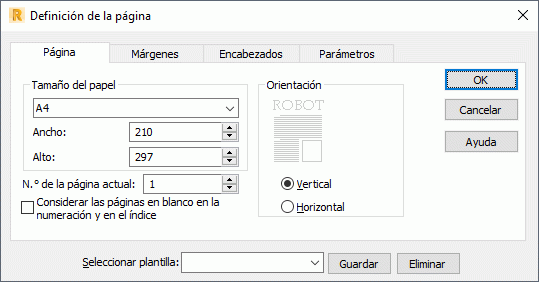 Defina el tamaño de papel, la orientación y el número de página actual en este cuadro de diálogo.