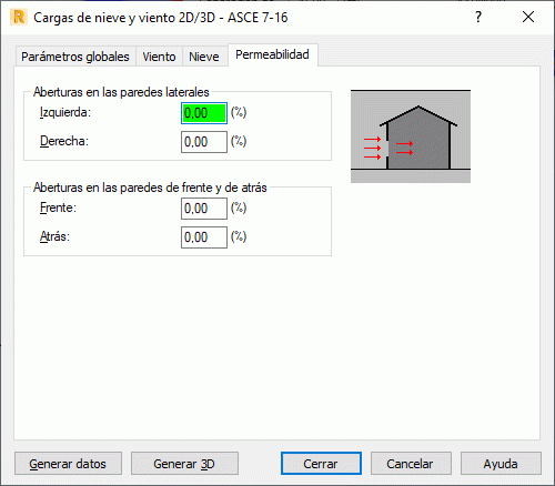 Al abrir el cuadro de diálogo Cargas de viento y nieve y hacer clic en la ficha Permeabilidad, se muestra el siguiente cuadro de diálogo.