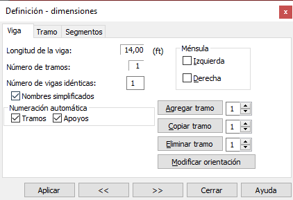 En la parte inferior del cuadro de diálogo hay campos de selección que permiten activar la numeración automática de apoyos y tramos. Si estas opciones están activadas, el programa asignará automáticamente nombres a los sucesivos tramos y apoyos definidos; si las opciones no están activadas, es posible asignar nombres propios a los tramos/apoyos en la ficha Tramo.