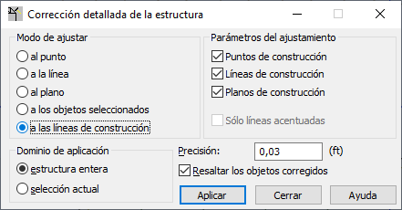 En la parte inferior del cuadro de diálogo, hay dos opciones: Estructura entera o Selección actual. Indican el dominio para corregir una estructura. Además, se puede determinar la precisión, que es un valor de distancia que define el rango en el que se realizan las correcciones de una estructura. Las correcciones de estructura solo se realizan cuando la distancia es menor que la precisión. Si la opción &Resaltar los objetos corregidos está activada, después de corregir el modelo de estructura, se seleccionan los objetos (barras, paneles, etc.) del área de dibujo cuya geometría se ha modificado.