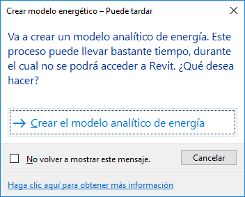 Este cuadro de diálogo evita que se inicie accidentalmente el proceso de creación del modelo energético. Para omitir este mensaje en el futuro, marque la casilla de verificación.