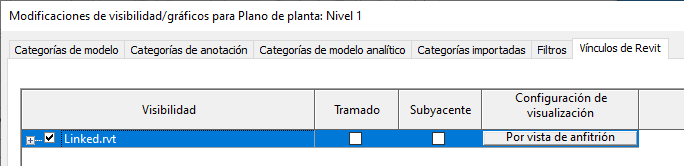 Si la opción Por vista de anfitrión no se muestra, haga clic en la columna Configuración de visualización. En la ficha Básicos del cuadro de diálogo Configuración de visualización de vínculos RVT, seleccione Por vista de anfitrión y haga clic en Aceptar.