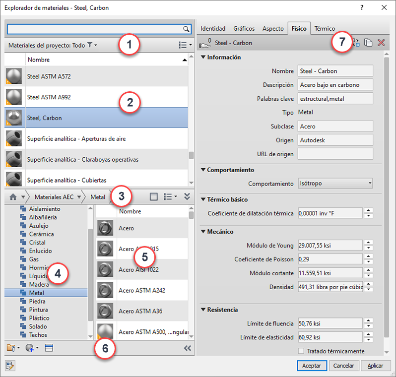 | 7 | Cuando se selecciona un material en la lista de bibliotecas (panel izquierdo), el panel derecho muestra las fichas (objetos) asociadas al material. Haga clic en las fichas (por ejemplo, Identidad o Apariencia) para ver las propiedades y objetos del material. Cuando se visualizan los materiales de las bibliotecas, las propiedades son de solo lectura. |