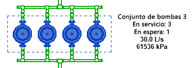 Cree un conjunto de equipos mecánicos cuando desee utilizar bombas que funcionen en condiciones paralelas. Para permitir un cambio de tamaño de tubería más preciso, el flujo equivalente se calcula en dos o más bombas en función del número de bombas en servicio del conjunto.