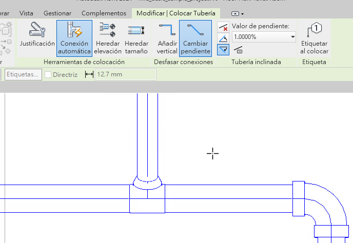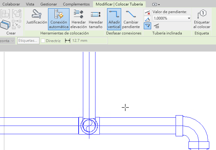 - Para conectarla directamente, sea cual sea el valor de pendiente, en la cinta de opciones, haga clic en la ficha Modificar | Colocar tubería
