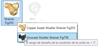 Al hacer clic en la flecha, una lista desplegable muestra piezas adicionales en función del tamaño. Esta lista desplegable se controla mediante las condiciones de definición del servicio, de forma similar a las preferencias de ruta. Por ejemplo, una curvatura puede utilizar una curvatura hacia arriba prensada hasta un determinado tamaño y una curvatura segmentada superior a ese tamaño. Al colocar el cursor sobre una pieza en la lista, una información de herramientas muestra el rango de tamaño basado en la condición de dicha pieza.