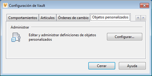 Los administradores pueden crear, editar y suprimir las definiciones de objeto personalizado. Para acceder a la configuración de administración de objetos personalizados, haga clic en Configurar en la ficha Objetos personalizados del cuadro de diálogo Configuración de Vault.