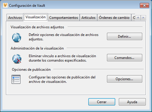 La ficha Visualización del cuadro de diálogo Configuración de Vault contiene opciones para configurar archivos adjuntos de visualización, administrar archivos de visualización y configurar parámetros de publicación.