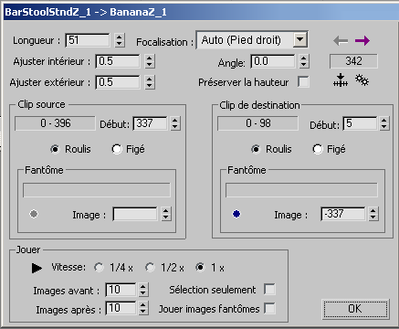 Copie la valeur du champ Image de la zone Fantôme dans le champ Image de début de la zone Clip. La position du clip de destination change pour adapter le corps du bipède dans le clip de destination au corps du bipède dans le clip source.
