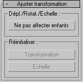 Pour transformer un objet et son pivot sans affecter ses enfants, utilisez les boutons du panneau déroulant Ajuster transformation. Si vous ajustez les transformations d'un objet, les enfants liés à celui-ci ne seront pas affectés.