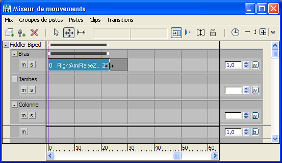 Dans le mixeur de mouvements, vous pouvez raccourcir des clips ou changer leur synchronisation de manière interactive dans la zone d'affichage des pistes.