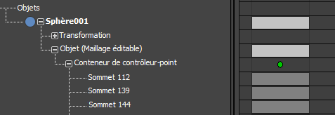En mode Feuille d’expo, le conteneur de contrôleur-point s’affiche sous la forme d’une piste avec des clés vertes dans la vue piste. Les sous-pistes situées au-dessous de la piste principale contiennent tous les sommets animés, les points de contrôle et les vecteurs.