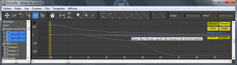 Pour utiliser l'outil de resynchronisation, ouvrez la vue piste en mode Editeur de courbes, puis sélectionnez les pistes à resynchroniser. Ensuite, après avoir activé l'outil, cliquez deux fois dans la fenêtre de l'éditeur de courbes de la vue piste afin de placer des marqueurs de resynchronisation. Chaque paire adjacente de marqueurs verticaux inclut le temps qui les sépare dans les pistes sélectionnées. Vous déplacez ensuite les marqueurs pour modifier la synchronisation de l'animation. Si vous les rapprochez, l'animation s'accélère ; si vous les espacez, l'animation ralentit.