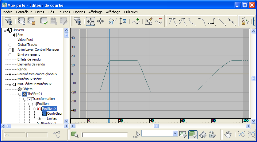 Il est possible d'animer cette valeur (en faisant appel à la technique des images clés ou à d'autres méthodes d'animation classiques) et de manipuler cette animation dans la vue piste par l'intermédiaire de la piste Limite supérieure dans la branche Limites du contrôleur.