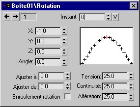 Contrôle les propriétés tangentielles de la courbe au niveau de la clé. Le paramètre par défaut est la seule valeur qui engendre une courbe d'animation lisse aux environs de la clé. Toutes les autres valeurs engendrent une discontinuité de la courbe d'animation, créant de ce fait un changement brusque dans l'animation. Valeur par défaut=25.