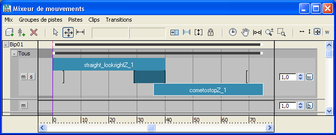 Le mixeur de mouvements vous permet d'étendre une transition à une zone où deux clips ne se chevauchent pas. Cependant, il est probable que cette transition produise des mouvements indésirables dans le mixage.