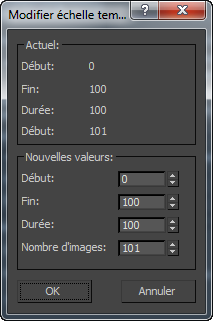 Ces valeurs sont interdépendantes. Par exemple, si vous modifiez la valeur de fin, 3ds Max met à jour les valeurs de durée et d'image en conséquence.