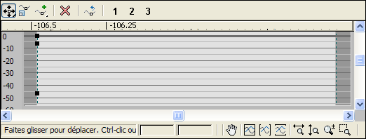 Les contrôles du graphique sont similaires à ceux disponibles dans les autres graphiques de 3ds Max, tels que le panneau déroulant Sortie de l'éditeur de matériaux. La barre d'outils située au-dessus du graphique offre des fonctions pour le déplacement et la mise à l'échelle de points sur le graphique, et permet également l'insertion de nouveaux points (insertion de nouveaux états). Ces fonctions sont également disponibles en cliquant avec le bouton droit de la souris sur le graphique. En outre, si vous cliquez avec le bouton droit de la souris sur un point du graphique, vous pourrez lui affecter le type Coin ou deux types Bézier différents. Si vous sélectionnez un point Bézier, vous pouvez remodeler la courbe en déplaçant ses poignées. Vous pouvez faire glisser une région pour sélectionner plusieurs points et les modifier ensemble. Utilisez la barre d'outils située sous le graphique pour obtenir une vue d'ensemble du graphique ou agrandir une zone particulière.