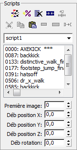 Les outils de la zone Scripts vous permettent de créer, de supprimer ou de nommer un script, d'éditer une transition, un clip ou encore positionner la totalité d'une animation. Vous pouvez créer un mouvement aléatoire pour un ou plusieurs bipèdes en utilisant les commandes de ce panneau déroulant. La zone Scripts du panneau déroulant Séquence est uniquement accessible lorsque le mode Séquence est activé.