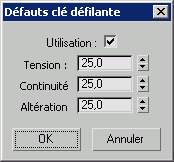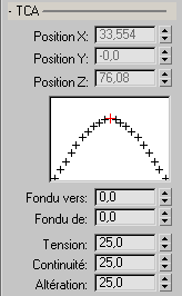 - Contrôle les propriétés tangentielles de la courbe au niveau de la clé. Le paramètre par défaut est la seule valeur qui engendre une courbe d'animation lisse aux environs de la clé. Toutes les autres valeurs engendrent une discontinuité de la courbe d'animation, créant de ce fait un changement brusque dans l'animation. Valeur par défaut=25.