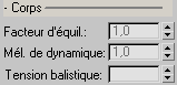 Ces paramètres s'appliquent au centre de gravité du bipède et sont utilisés par Character Studio pour calculer la trajectoire en suspension du bipède en fonction de la gravité (Accélération gravité) et de la durée entre les pas, ainsi que du fléchissement des genoux à la réception (Tension balistique) et de la façon dont les objets du bipède s'adaptent pour lui faire garder l'équilibre (Facteur d'équilibre).