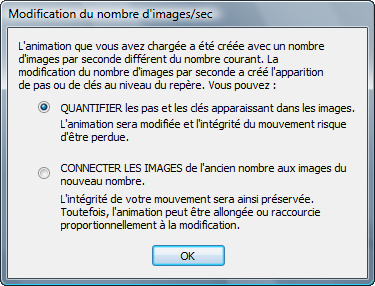 Bipède affiche cette boîte de dialogue si vous chargez un fichier BIP dans un bipède et que ce fichier a été enregistré à partir d'une scène dont la cadence d'images est différente de celle de la scène courante.