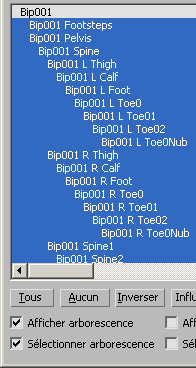 Remarque : dans la hiérarchie du bipède, le centre de gravité est l'objet racine. Si celui-ci est sélectionné lorsque la commande Sélectionner sous-arborescence est activée, tous les liens enfants sont sélectionnés y compris les squelettes supplémentaires et la peau du maillage (celle-ci est attachée à l'aide de l'option Attacher à noeud dans Physique).