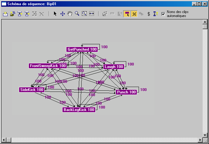Toutes les transitions qui lient des clips ont un poids de 100, ce qui signifie qu'elles ont toutes la même chance d'être utilisées de manière aléatoire.